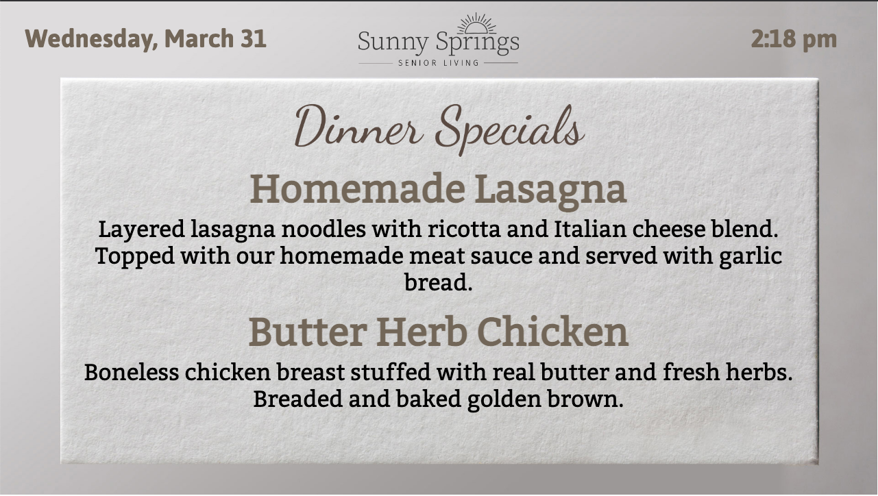 The slide will display two Lunch Specials until 1pm. Then the slide will display two Dinner Specials until midnight. At midnight, the slides switch to the next day’s Lunch Specials.