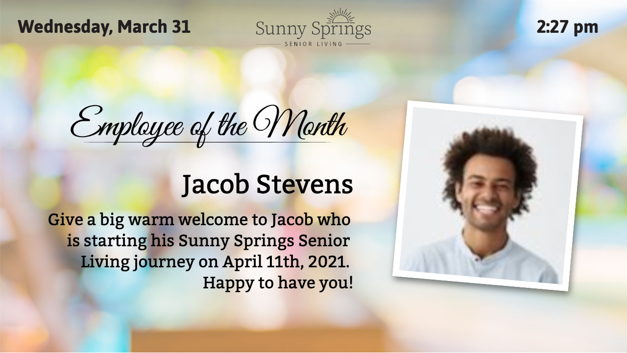 The employee of the month slide is a custom-type digital signage slide. The user can select a staff member from the list and add text to the description area. If there is a staff member profile photo loaded, it will be displayed on screen. If the staff member doesn’t have a profile photo loaded, the text will be center-aligned on screen.