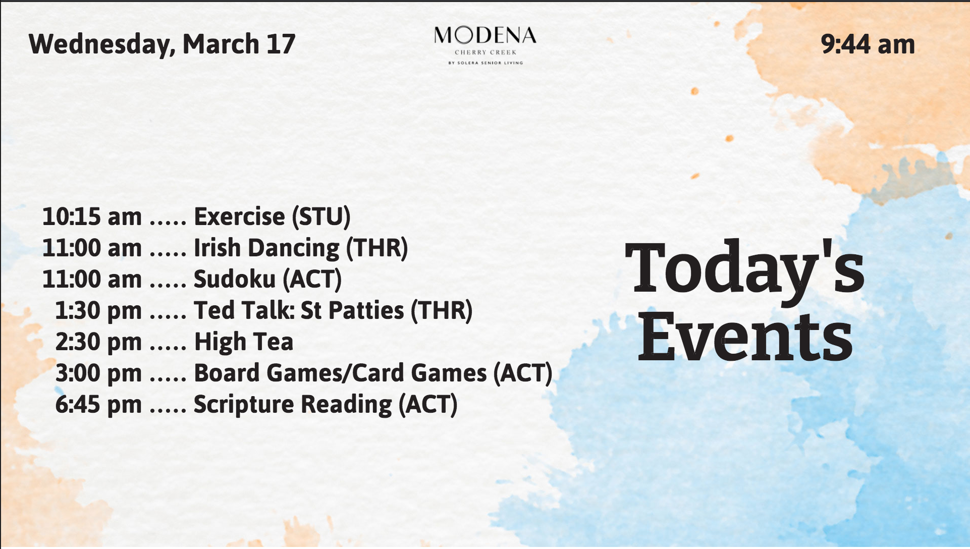 The events today slide shows all events happening in the community today. The start time is displayed to the left of the event title. The event location code is displayed in parentheses to the right of the event title.